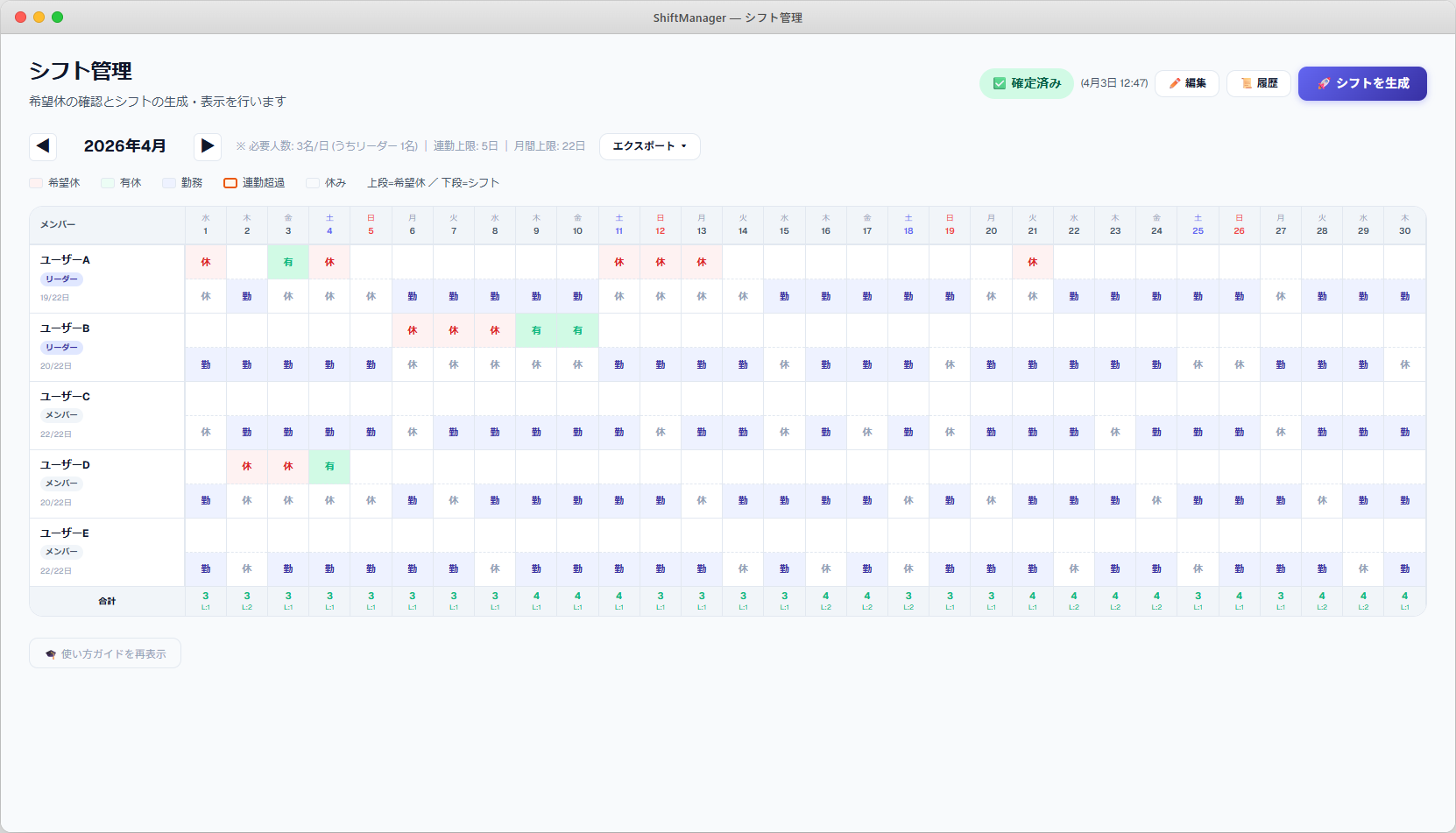 スタッフの希望休を集めて、シフトを自動生成。紙やExcelでの面倒なシフト調整から解放されます。